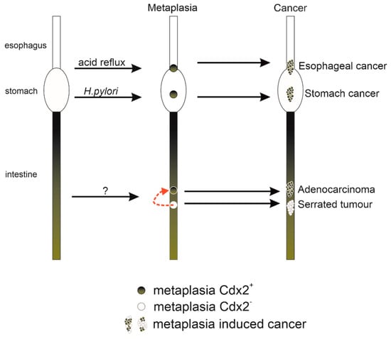 As with many of the Hox genes, loss-of-function mutation of Cdx2 in mice is associated with anterior homeotic transformation of the axial skeleton []. Similarly, loss-of-function mutation of the related paralogue Cdx1 also causes anterior homeotic shifts [] and these patterning defects become further exacerbated in Cdx1/Cdx2 compound mutants []. Null mutants of the third paralogue, Cdx4, do not exhibit skeletal defects, but exacerbate the axial patterning defects of both Cdx1 and Cdx2 mutants []. These findings illustrate not only functional overlap, but show that their collective activity is required to achieve wild-type levels of functional activity—i.e., their functional overlap does not equate to functional redundancy. As such, any genetic or environmental factors that alter Cdx protein levels can have significant effects on establishing positional identity. This is true not only during embryogenesis, but also following regenerative tissue repair in adult tissues, where the reestablishment of positional identity can be required. Incorrect reprogramming of tissue identity in adult tissues is termed metaplasia and metaplasia is increasingly recognized as a major risk factor for developing cancer. This review will focus on the function of Cdx2 and, less so, its paralogues, Cdx1 and Cdx4, and how genetically engineered mutations of these genes have provided us with animal models that have spurred our understanding of the important links between metaplasia and cancer.