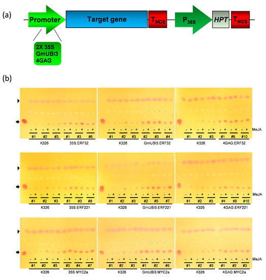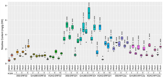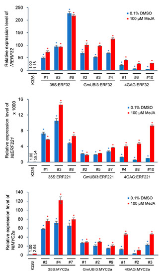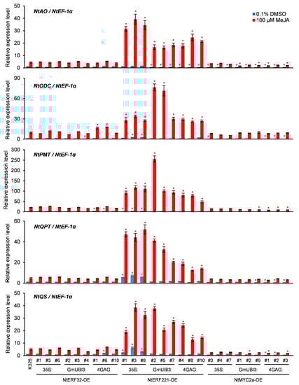 3.1. Constitutive and Inducible Overexpression of Transcription factors NtERF32, NtERF221, and NtMYC2a Increases Nicotine Contents