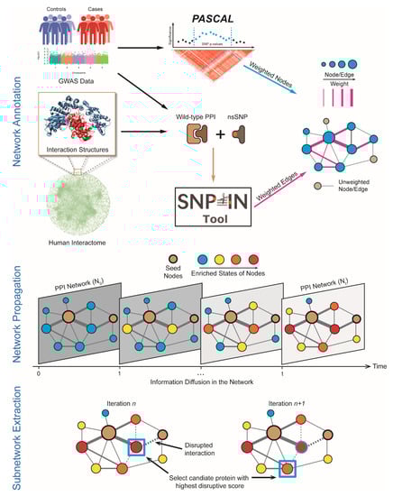 Basic workflow of Discovering most IMpacted SUbnetworks in interactoMe (DIMSUM) computational framework. The module detection framework contains three major steps: network annotation; network propagation and subnetworks extraction. In Network Annotation stage, we collect GWAS data and use Pascal tool to aggregate single nucleotide polymorphisms (SNP) summary statistics. Then we apply the non-synonymous SNP INteraction effect predictor tool (SNP-IN) tool to properly assess SNP’s impact on the protein–protein interactions. Finally, we integrate this information with the human interactome to generate a fully weighted network. In Network Propagation stage, we apply a network propagation procedure to implicate genes most likely to be influenced by disruptive SNPs. Finally, in Subnetwork Extraction stage, we apply an iterative strategy to identify the most impacted module.