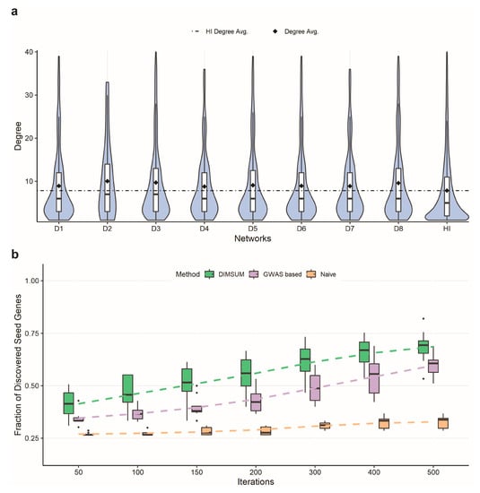 Annotated networks and comparison of DIMSUM against a naïve and a GWAS based network propagation procedures. (a) The first eight violin plots represent the node degree distributions of disruptively mutated genes for eight complex diseases; the last violin plot is the node degree distribution of all genes in the human interactome (HI); the avg. degree of the disrupted genes is much greater than the avg. degree of HI, showing that highly connected genes are disrupted. (b) Comparison of the seed genes discovered when randomly selecting 25% of the seed gene pool as seeds. Each box plot represents the fraction of discovered seed genes across all eight diseases from DIMSUM, a GWAS based and a naïve network propagation at different iterations. DIMSUM performs significantly better than the other two approaches at the initial 50 iterations and improves drastically with increasing iterations.