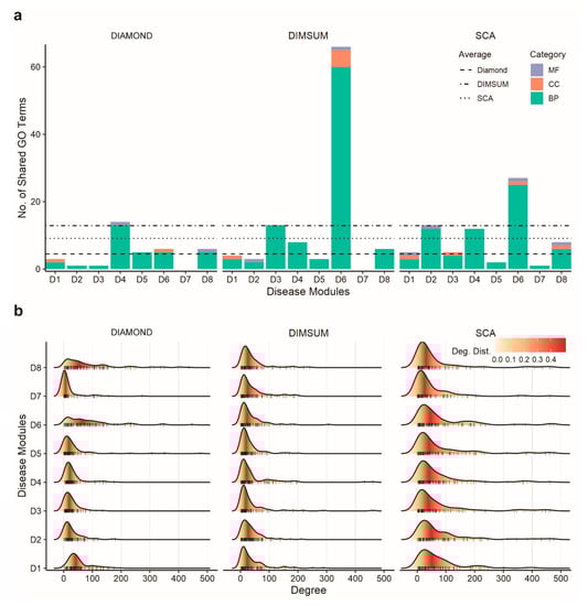 Comparison of biological relevance and topological properties of disease modules detected using three methods. (a) Bar graphs representing the number of the GO terms enriched in the added genes overlapped with the seed genes for DIAMOnD, SCA, and DIMSUM for the eight disease modules. The three GO term categories are Cellular Component (CC), Molecular Function (MF), and Biological Process (BP). The average of significant and identical GO terms from DIMSUM is higher than from DIAMOnD or SCA. (b) Degree distribution of the added genes during module detection for the eight diseases by each method. When building a module, DIMSUM avoids bias towards always including the nodes of high degree and has lower node degrees for all eight modules.