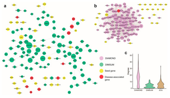 The CAD disease module from DIAMOnD formed a clique-like structure (Figure 4b). There were dense connections inside the largest connected component, the property typically not observed in a functional module [26]. Besides, the largest component originated from only seven seed genes. During the later stage of the DIAMOnD algorithm, extraction of additional genes to form the disease module was determined by several genes, including FAM209A, STX1A, and CREB3L1, which were not seeds and which were added in the early steps of the method run, rather than from the initial seed gene pool. We surveyed the literature and did not find a strong link between these non-seed genes and CAD. We also observed that the rest of the seed genes became isolated and separated from the largest component. On the contrary, SCA generated a globular structure for the disease module, in which the largest connected component (LCC) includes most of the seed genes. This is not surprising, as SCA is specifically designed to add a “seeds connector” to grow the LCC maximally, rather than the genes with functional importance. The addition of the seeds connector, therefore, was biased towards the hubs in the interactome. SCA tended to add many genes with high values of node degrees, as indicated by the long tails of the degree distributions. This phenomenon was not only demonstrated in the case of CAD module, but was also evident for the other diseases we studied (Figure 3b). However, recent work revealed that proteins connected to the high-degree hubs were less likely to have similar functions, compared to the proteins that interacted with a protein of significantly lower node degree [24].