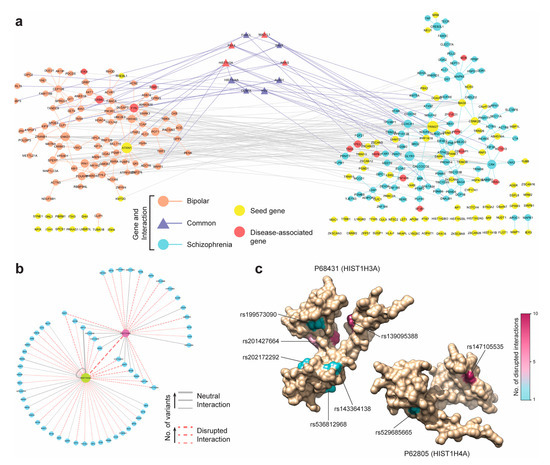Finally, we determined if the BPD and SCZ modules shared any genes—or more importantly, submodules—in common. It had been established that bipolar disorder and schizophrenia shared a large overlap of genetic risk loci and often exhibited similar symptoms like mania and depression [54]. Thus, in spite of the missing overlap between the two seed genes sets between those disease, the modules enriched with more disease-related genes could share common genes. Intriguingly, the BPD and SCZ modules were found to share a smaller sub-module of 10 genes connected with each other and with other BPD and SCZ genes (Figure 5a). Out of 10 genes found shared between BPD and SCZ modules, four genes (HIST1H3A, PBX4, MAD1L1, and NRAS) were known to be strongly associated to both disorders (Figure 5a). We conjectured that the common genes between the BPD and SCZ modules could provide insights into the phenotypic similarities between the two diseases. To support this hypothesis, we revisited the functional predictions from the SNP-IN tool involving these ten genes. We found that while the mutations occurring in both diseases were quite diverse, a small group of mutations targeted the same subnetwork centering around HIST1H3A and HIST1H4A (Figure 5b). Both of these genes were the core units of the nucleosome, implicated in a number of neuro-psychiatric disorders [67,68]. Most of the mutations occurring in this subnetwork were predicted by the SNP-IN tool to disrupt the corresponding PPIs (Figure 5c, Supplementary Table S7). Thus, different mutation frequencies and combinations for BPD and SCZ could give rise to different rewiring, or edgetic, effects of the HIST1H3A/HIST1H4A centric subnetwork. These results lead us to suggest that the different rewiring patterns of the same subnetwork could explain the phenotypic similarity but underlie differences in symptomatic severity between the two diseases.