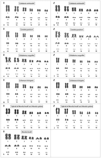 According to our knowledge, we present the first description of karyotypes of five species, namely Calabaria reinhardtii (Calabariidae), Candoia paulsoni (Candoiidae), Chilabothrus angulifer (Boidae), Lichanura trivirgata (Charinidae), and Morelia bredli (Pythonidae) (Figure 1).