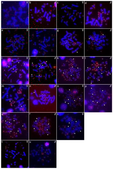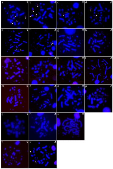 The karyotype consists of 34 chromosomes with 18 macro- and 16 microchromosomes, as previously described [,]. The results of C-banding and CGH can be found in []. The telomeric sequences were detected in terminal positions of the chromosomes (Figure 3t,u). FISH with the rDNA probe uncovered a signal on one pair of microchromosomes (Figure 4t,u). Accumulation of (GATA)8 microsatellite was detected in one pair of microchromosomes in the male, but not in the female (Figure 5t,u).