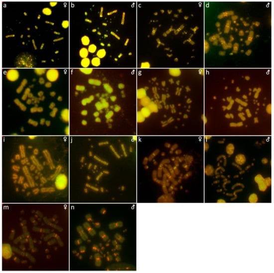 The karyotype is composed of 2n = 36 chromosomes (16 macro- and 20 microchromosomes) as was previously described []. C-banding revealed a strong accumulation of heterochromatin in pericentromeric regions (Figure 2g,h). The telomeric sequences were detected in terminal positions of the chromosomes. FISH with telomeric probe uncovered ITRs on the 1st, 2nd, and 6th chromosomal pairs (Figure 3k,l). rDNA was accumulated in one pair of microchromosomes (Figure 4k,l). FISH with probe specific for (GATA)8 motif did not reveal a signal on any chromosomes (Figure 5k,l). We did not detect any sex-specific differences at sequence level by CGH (Figure 6g,h).