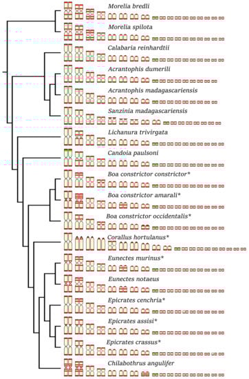 Idiogram showing the comparative topology of ITRs (in red) and rDNA loci (in green) on the chromosomes of 18 species of boas and pythons. The original data were extracted from Viana et al. [] for species marked with asterisk (*). The phylogenetic relationships follow Reynolds et al. [].