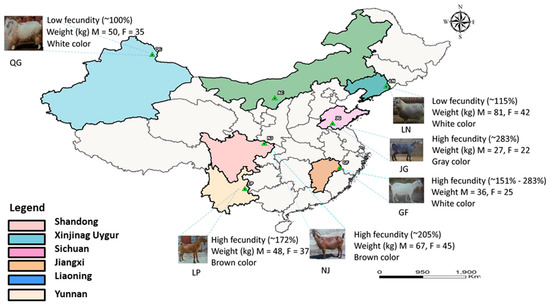 A total of 206 goats representing six goat populations, including GF, JG, LN, LP, NJ, and QG, were selected for our study. A short introduction (breed name, sample size, fecundity rate, demography and breeding practices, average altitude and agro-ecology and feeding mode) to these goat breeds is provided in Table S1.