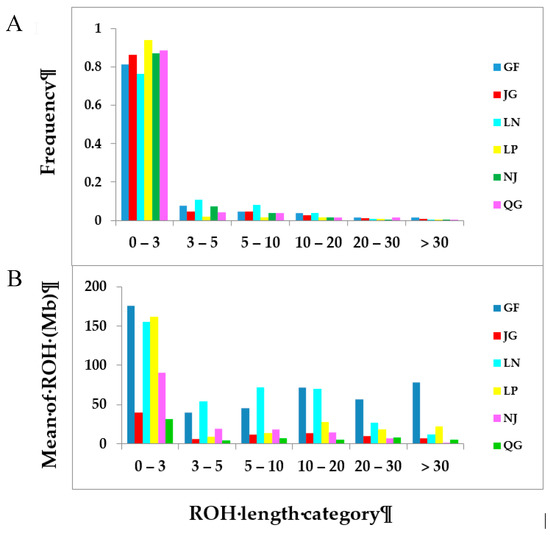 The frequencies of ROH numbers in different length classes are illustrated in Figure 4A. Our results show an inverse relationship between ROH length and frequency. The frequencies of shorter ROHs (0–3) predominated; the number of these ROHs accounted for 82.72% of the total number of ROHs. However, the frequency of ROHs in this major class varied between breeds. The majority, more than 90% of the ROHs in this class, were obtained from LP breeds, whereas the percentage was at least 80% for GF, JG, NJ, and QG, and less than 80% for the LN breed. GF and LN had the highest frequencies of ROHs among all breeds in the length category greater than three. Figure 4B shows the distribution of ROH within breeds. Among the six ROH categories under consideration, the short ROHs (<3) are most prevalent across the populations, wherein the average ROH mean spanned from 31 (QG) to 175 (GF). The longest ROH category (>30) was the rarest, wherein the GF breed displayed the highest mean ROH compared with the other breeds.