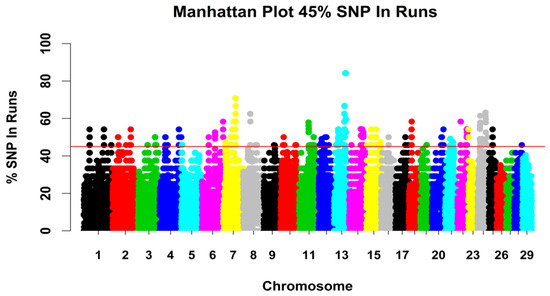 To identify the genomic regions with a high ROH frequency, the percentage of occurrences of an SNP in an ROH was calculated by counting the number of times the SNP was detected in an ROH across the population. The SNPs showing a percentage higher than 45% were selected as genomic regions with a high frequency of ROHs for further analysis. We used the caprine reference genome annotation file from the NCBI website to annotate the genes identified at particular genome coordinates for all the selected regions [25].