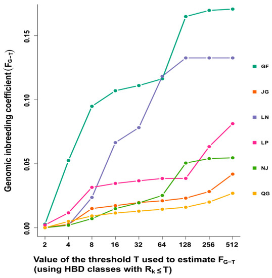 The average inbreeding coefficient was estimated using the HBD class. GF goats displayed the highest average inbreeding coefficient, followed by the LN breed. An increasing trend of inbreeding coefficient with ancient classes was observed across the breeds, whereas the GF goats showed a rapid increase in the inbreeding coefficient from 0.00 for an estimate based on the first class (RK = 2) to 0.09 with RK ≤ 8, and then increasing marginally up to RK ≤ 64. The highest value was observed at RK = 512 (0.169) (Figure 9). A similar pattern for the inbreeding coefficient was found for LN: rapidly increasing up to RK ≤ 64, and the highest inbreeding coefficient was found at RK ≤ 128 (0.134).