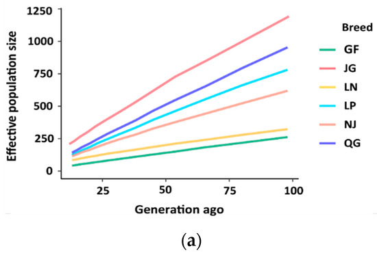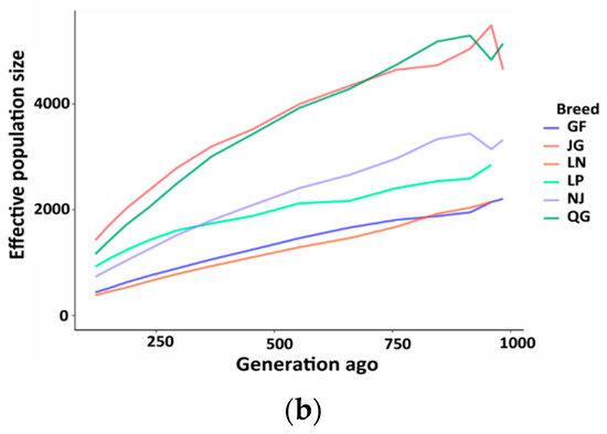 Ancestral and recent effective population sizes (Ne) for six goat populations are presented in Figure 10. Estimated Ne showed a downward trend with the increase in generations across the populations. The most rapidly declining recent Ne was found in the GF and LN breeds, whereas JG and QG showed a slowly declining trend in Ne (Figure 10b).