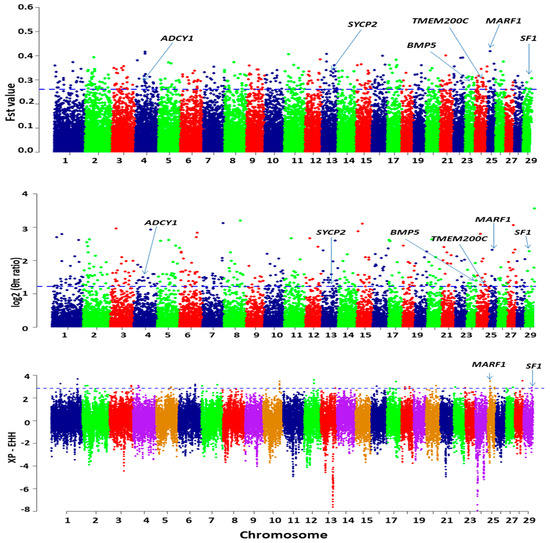 Selection signature detection in the high fecundity group of goat populations. Dotted lines indicate the top 1% values of FST, and π, and 0.1% values of XP-EHH.