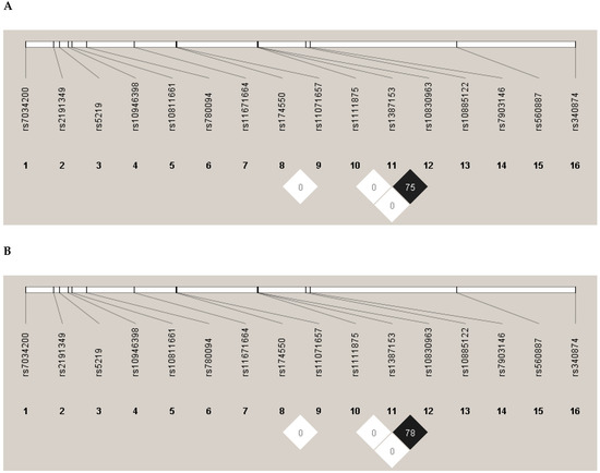 Hardy−Weinberg equilibrium (HWE) of the genotyped SNPs was examined with a chi-square test. Linkage disequilibrium (LD) between polymorphisms was tested by Haploview software (version 4.2). Deviation of the data from the normal distribution was checked using the Shapiro−Wilk test. When it was necessary, quantitative variables such as age, high-density Lipoprotein Cholesterol (HDL-C), body mass index (BMI), triglyceride (TG), and weighted genetic risk score were transformed using a two-step approach suggested by Templeton to reduce the effects of non-normality [