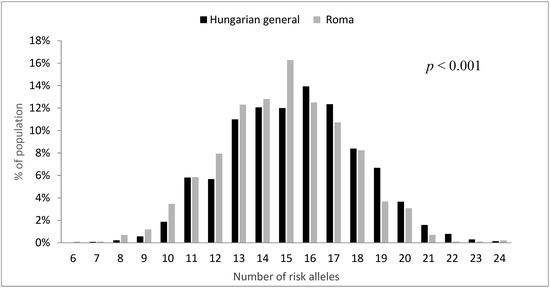 The aim of the present study was to estimate and compare the risk allele load in the Roma and Hungarian general populations using the GRS modeling approach based on 16 SNPs related to T2DM, and to investigate whether the higher prevalence of PreDM and T2DM among Roma is due to inheritable and/or other factors. The findings of this research—in addition to contributing a better understanding of the genetic background of T2DM in different ethnic populations—can be used for identification of the groups for interventions targeting diabetes prevention in both populations.