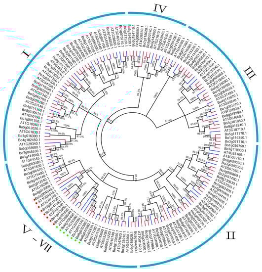 Phylogenetic tree of B. oleracea and A. thaliana U-box proteins. MEGA X was used to construct the phylogenetic tree with the maximum likelihood (ML) method involving 1000 bootstrap replications. The red lines at the end of the branches indicate the B. oleracea gene, the blue lines indicate the A. thaliana gene, and the whole tree is divided into seven groups (I–VII). The red dots represent Group VI, the green dots represent Group V, and the remainder represent Group VII. The grouping results of this phylogenetic tree are consistent with those of Figure 3.