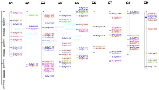 As shown in Figure 4, a total of 102 BoPUB genes are mapped to C1–C9 chromosomes. The Bo00615s220.1 gene is a novel gene identified by transcriptome sequencing, and is located on the chromosome scaffold and cannot be visualized. Different groups of genes are represented by different colors according to the aforementioned grouping. The number of genes on each chromosome is unevenly distributed, and up to 21 genes are distributed on the C3 chromosome (Figure 4), indicating the complex diversity of the U-box family genes in B. oleracea. In addition, there are more gene clusters in C3, C4, C5, C7, C8, and C9 chromosomes, indicating that these gene amplification products belong to a common ancestor. The homologous gene relationship between C3, C1, and C5 is the most obvious, since there are many tandem duplication events (Figure 2A and Table S2).