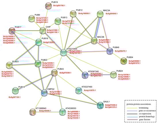 The amino acid sequences of 60 U-box genes in A. thaliana were extracted and the interaction network was constructed by the STRING (https://string-db.org/) program []. Based on the relationship between orthologous genes of B. oleracea and A. thaliana, the interaction of the U-box gene was presumed.