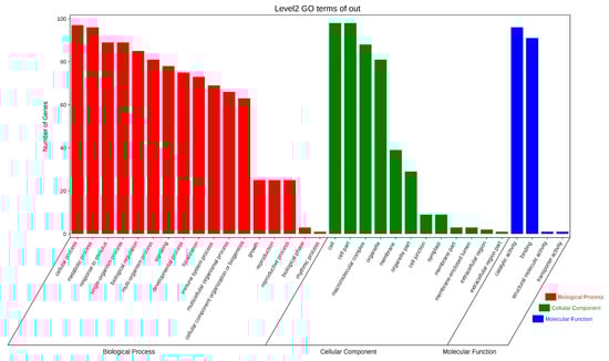 Gene Ontology enrichment analysis of the U-box gene in B. oleracea. Red indicates biological processes, green represents cell components and blue indicates molecular function. The ordinates represent the number of genes enriched into the entry.