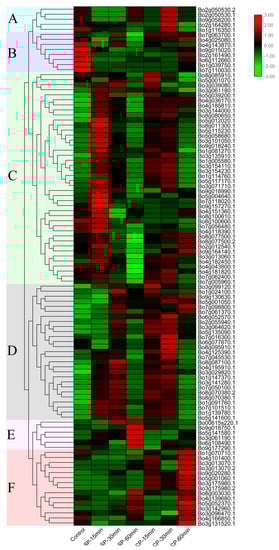In order to understand the expression of the U-box whole gene family members of B. oleracea in different pollination conditions and times, the expression levels of these 103 genes were quantified by FPKM (fragments per kilobase of transcript per million fragments mapped) values of RNA-seq data []. The heat map was drawn according to the log2 (FPKM) values (Table S5) of pollinated 0 min, CP-15/30/60 min, and SP-15/30/60 min, and clustered into A–F based on the expression profile characteristics of these genes (Figure 7 and Table S5).