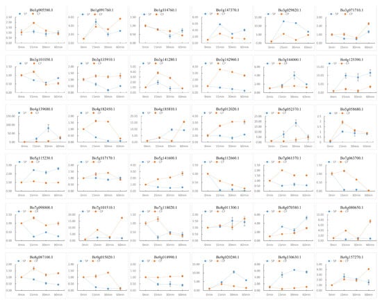 Gene expression is temporally and spatially specific. Genes with significant differences in expression levels under different conditions are called differentially expressed genes (DEG). A total of 36 differentially expressed genes were screened out using fold-change ≥2 and FDR <0.01 as screening criteria in the process of differentially expressed gene detection []. The expression levels of 36 differentially expressed genes were detected by RT-qPCR and are plotted as a line graph to verify the up- and -down-regulation of pollination at 0 min, CP-15/30/60 min, and SP-15/30/60 min (Figure 8 and Table S1). The abscissa in Figure 8 indicates the time after pollination, the ordinate indicates the relative expression level, and the error bars indicate the standard deviation (±SD) of the three biological replicates under different pollination conditions. RT-qPCR results showed that some genes were significantly up-regulated after SP-15 min or SP-30 min, such as Bo1g147370.1, Bo3g029820.1, Bo4g125390.1, Bo5g052370.1, and Bo9g130630.1. It is notable that the up-regulation of these genes under the condition of CP is not obvious, indicating that these genes are highly likely to be involved in the SI-related signaling transduction pathways in B. oleracea. We further analyzed the relationship between these genes and the results of bioinformatics analysis, and found that the conserved motifs and structures of these genes are similar (Figure 3). Additionally, Bo1g147370.1, Bo3g029820.1, and Bo4g125390.1 formed a relatively close interaction and showed homology and co-expression (Figure 5). These proteins have ubiquitin-protein transferase activities []. Bo1g147370.1 may be involved in the abscisic acid-mediated signaling pathway [], while Bo3g029820.1 and Bo4g125390.1 coordinate control of drought signaling pathways []. Interestingly, from the chromosomal localization of highly significant differentially expressed genes (Figure 4), such genes are mostly located at C1, C3, and C5. Combined with tandem replication events (Figure 2A and Table S2), there is significant gene duplication among the three chromosomes. Whether there is a connection between the genes on these chromosomes is worthy of consideration.