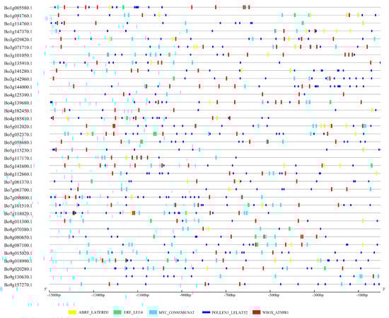 The 1500-bp sequences upstream of the translation initiation sites of 36 differentially expressed genes were extracted from the B. oleracea genome sequence. The cis-acting elements of the promoter region were analyzed and identified with the PLACE database []. The cis-acting elements of the promoter region were visualized by GSDS 2.0 (http://gsds.cbi.pku.edu.cn/).