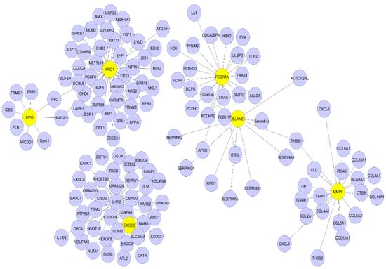 Protein-protein interaction (PPI) network analysis of significantly enriched sepsis-associated DEGs. The network of PPI interaction was constructed from the six identified DEGs. In total, 143 proteins were involved in this network. The six DEGs are in yellow and their interacting partners are purple.