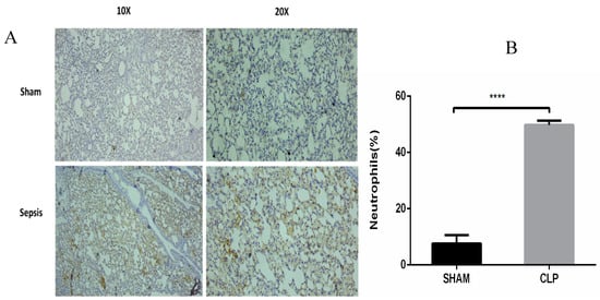 The expression of Myeloperoxidase in neutrophil granulocyte within lung alveoli was assessed by the immunohistochemical technique in the sham and CLP groups. (A)This represents strong immunoreactivity in the well-established CLP sepsis animal model as compared to the sham group; (B) the significant increase in neutrophil numbers in sepsis as compared to the control. Data are represented as mean ± SEM; experiments were performed in triplicate, with statistical significance at p-vaule < 0.0001.