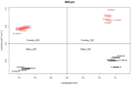 Multi-dimensional scale (MDS) plot showing segregation of pig conceptuses (25D: embryos at 25 days-old and 35D: fetuses at 35 days-old) into two distinct sex groups. Red: Female conceptuses; Black: Male conceptuses; Samples identification: male embryos from supplemented (E-25DA-M) or non-supplemented (E-25DC-M) gilts; male fetuses from supplemented (F-35DA-M) or non-supplemented (F-35DC-M) gilts; female embryos from supplemented (E-25DA-F) or non-supplemented (E-25DC-F) gilts; female fetuses from supplemented (F-35DA-F) or non-supplemented (F-35DC-F) gilts.