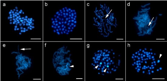 DAPI (4′,6-diamidino-2-phenylindole)-stained mitotic and meiotic chromosomes of P. betulina, T. tubulosa, and D. laichartingella. Different numbers of chromosomes in mitotic metaphases of P. betulina females with 2n = 61 (a) and males with 2n = 62 (b), and the presence of a Z-chromosome univalent (arrows) in female pachytenes of P. betulina (c), T. tubulosa (d), and D. laichartingella (e) indicate the absence of the W chromosome in these species. In P. betulina, a strongly heterochromatinized bivalent was observed in male pachytenes (f); mitotic metaphases with less condensed chromosomes showed two DAPI-highlighted chromosomes in males (g), and only one DAPI-highlighted chromosome in females (h). These heterochromatin DAPI-positive elements (arrowheads) probably represent a Z-chromosome bivalent (f) and Z chromosomes (g,h). Bar = 10 µm.