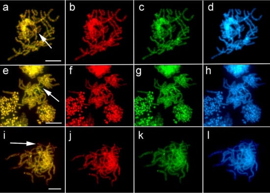 - Kato, A.; Albert, P.S.; Vega, J.M.; Birchler, J.A. Sensitive fluorescence in situ hybridization signal detection in maize using directly labeled probes produced by high concentration DNA polymerase nick translation. Biotech. Histochem. 2006, 81, 71–78. [Google Scholar] [CrossRef]