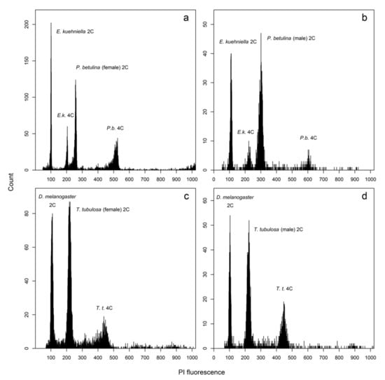 Examples of flow cytometric fluorescence histograms of Psychidae species P. betulina (a)—female, (b) male and T. tubulosa (c)—female, (d)—male). In all cases, 2C and 4C peaks are clearly visible. Peaks of the internal standards E. kuehniella and Drosophila melanogaster are denoted in a similar way. PI = propidium iodide.