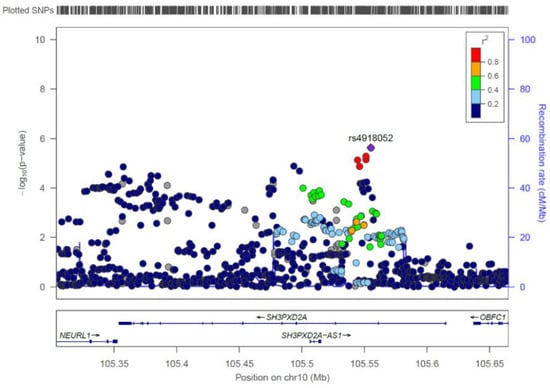 The present gene analysis prioritized SH3PXD2A at chromosome 10q24.33 as a candidate gene for nsCL/P. SH3PXD2A is a protein-coding gene with 15 exons and a size of 267 kb. The SH3PXD2A gene product is necessary for the formation and function of podosomes, which are structures located on the cellular surface that establish close contact with the extracellular matrix, and are involved in cell migration and matrix degradation []. Observations in zebrafish and knockout mice suggest that SH3PXD2A is also a potential risk gene for orofacial clefting [,]. In mammals, the primary and secondary palate forms from cranial-neural-crest-cell-derived mesenchymal protuberances, and any alteration in the growth, proliferation, movement, adhesion, or death of cells composing the palatal structures can affect palatal architecture and lead to orofacial clefting. SH3PXD2A encodes TKS5, a scaffold protein shown to be fundamental to zebrafish neural crest cell migration in vivo []. However, even stronger support for that SH3PXD2A may be a cleft candidate gene has been generated by Cejudo-Martin et al., who showed that disruption of the mouse Sh3pxd2a gene was associated with complete cleft of the secondary palate in 50–90% of mutant mice []. Of note, the fact, that the mouse model in Cejudo-Martin et al. has a cleft of the secondary palate but not a cleft lip, does not speak against this gene being also involved in nsCL/P formation in humans. The present gene analysis provides the first strong support for the involvement of SH3PXD2A in non-syndromic cleft formation in humans.