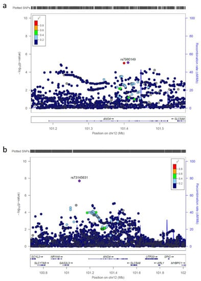 An unreported suggestive locus at chromosome 12q23.1 (a) Regional association plot showing a genome-wide significant marker upstream of the anoctamin 4 (ANO4) gene. It is of note that in our dataset, there were no SNVs in LD with the lead SNV rs73145631. (b) Regional association plot for the ANO4 gene.