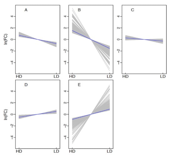 Cluster analysis of the differentially expressed genes’ (DEGs’) expression patterns in both HD and LD. The Y axis represents logarithm of fold change (FC) with expression levels relative to the mean of the same gene. (A–E) indicate clusters 1–5, respectively.