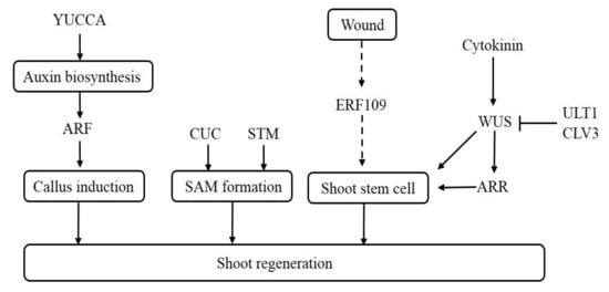 In essence, regeneration is a process in which cell fates change owing to wounding or stress []. Recently, massive mechanisms mediating regeneration, especially the de novo shoot regeneration of organogenesis, had been investigated. Under tissue culture condition, the transition of callus into stem cells and the subsequent differentiation of stem cells into shoot apical meristem are the two key processes during shoot regeneration []. For the stem cell commitment, WUSCHEL RELATED HOMEOBOX11 (WOX11) and WOX12 are involved in the first-step cell fate transition during de novo root organogenesis []. Zhang et al reported an essential role of WUSCHEL (WUS) in de novo establishment of shoot stem cell niche in Arabidopsis thaliana []. CUP-SHAPED COTYLEDON (CUC), encoding a NAC (No Apical Meristem)-domain protein, is involved in the regulation of shoot apical meristem (SAM) formation during organ differentiation []. Previous research showed that CUC and SHOOT MERISTEMLESS (STM) regulate each other’s expression throughout development, but STM controlled CUC expression in organ boundary region []. As a negative regulator of meristem cell accumulation, ULTRAPETALA1 (ULT1) negatively regulates WUS expression during meristem development []. To associate shoot regeneration with hormone pathways, the removal of H3K27me3 at WUS can be promoted by the cytokinin-rich environment, facilitating activation of Arabidopsis response regulators (ARRs) in cytokinin signaling pathway []. Members in YUCCA family orchestrate the endogenous auxin biosynthesis responsive for organogenesis []. For organogenesis of the root, gibberellin signaling is also combined with regeneration of organogenesis. Gibberellin signaling is involved in transcriptional inputs from the SHORT-ROOT (SHR), SCARECROW (SCR), and SCARECROW-LIKE3 (SCL3), to regulate root formation []. In response to auxin, for example, lateral organ boundaries domain gene 16 (LBD16), LBD18, and LBD29 are important downstream genes of the auxin response factor 17/19 (ARF7/19), playing a key role in regulating lateral root formation [,].