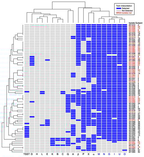 Unsupervised hierarchical clustering of cystic fibrosis (CF) clinical isolates based on presence of S. aureus toxin genes. Isolate numbers and subjects are indicated at right. Toxin genes are on the bottom margin, with members of the enterotoxin gene cluster (EGC) in blue. Letters A, B, C, D, E, and G are staphylococcal enterotoxin (SE) superantigens characterized as causing emesis after oral administration. Letters H, I, K, L, M–Q, and X are SE-like superantigens. TSST is toxic shock syndrome toxin-1 superantigen. α and β are cytotoxins. Blue shading represents toxin presence. MRSA isolates are indicated with red font. Dendrograms at left and top show relatedness of the isolates and toxins, respectively. The EGC was prevalent in both MRSA and MSSA isolates.