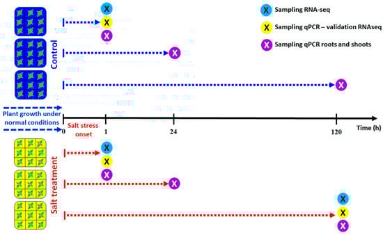 Experimental design and sampling times from the start of salt treatment for RNA-seq and real-time RT-qPCR analyses.