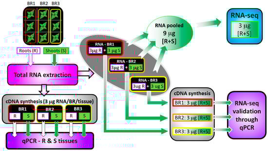 Scheme of RNA extraction from the roots (white square) and shoots (green square) and their utilization, either pooled or not, for RNA-seq and real-time RT-qPCR studies. BR: Biological replicate; R: Roots; S: Shoots. See Material and Methods, Section 2.1 and Section 2.2.