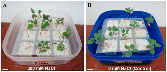 Forty-five-day-old quinoa plants grown in perlite used for RNA-seq and real-time RT-qPCR analyses (A) plants treated with 300 mM NaCl and (B) controls (0 mM NaCl). Scale bar = 1 cm.