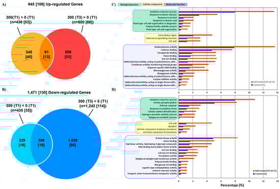 Venn diagrams showing the number of differentially expressed genes (DEGs) (n = 2416) in response to 300 mM NaCl at 1 h (T1) and 120 h (T3) after treatment and their overlaps. The number in square brackets indicates the number of genes encoding for transcription factors. (A) Genes induced by salt at 1 h and 120 h AT (after treatment) or both. (B) Genes down-regulated by salt at 1 h and 120 h AT or both. The size of each group is proportional to the total number of DEGs. (C,D) Functional categories and biological processes of genes that were induced (C) or repressed (D) by 300 mM NaCl at T1 and/or T3. Red bars: Salt-treated; blue bars: Controls.