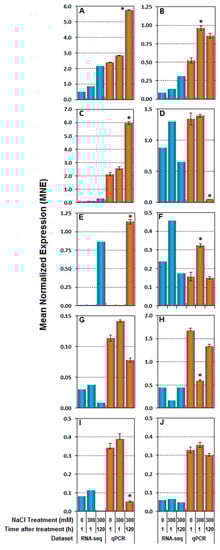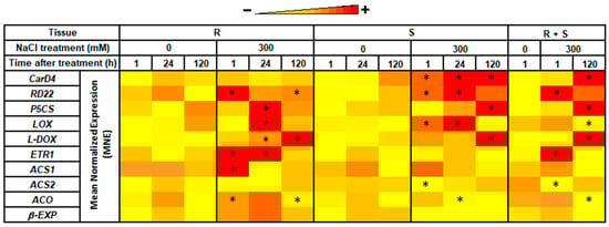 Heatmap representation of the expression profiles (mean normalized expression, MNE) of 10 selected genes after different times (1, 24, and 120 h) of exposure to 0 or 300 mM NaCl. RNA was extracted from roots (R) and shoots (S) separately or pooled prior to cDNA synthesis (R + S). Darker and lighter color shadings represent relatively higher and lower expression levels, respectively. Asterisks indicate significant differences (p < 0.05) relative to the control at 1 h.