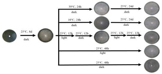 (4) Photoperiod: A mycelial tip plug of 5 mm in diameter was inoculated onto the MYG medium and incubated for 8 days at 25 °C in the dark condition. When hyphae covered the plate, the light growth chamber was maintained at three different photoperiod regimes of 12 h light/12 h dark, 24 h light/0 h dark, or 24 h dark/0 h light at 25 °C. Sampling was done every 4 h for 48 h successively (Figure 1).