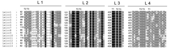 In a previous study, 13 laccase genes, excluding Lelcc8 in L. edodes D703PP-9, were analyzed and categorized into three subfamilies [11]. Phylogenetic analysis of the L. edodes W1-26 strain showed that Lelcc8 could be categorized into laccase sensu stricto subfamily 2 (Supplementary Figure S1). Analysis of laccase signature sequences (L1–L4) using amino acid sequence alignment showed that all the laccases of the W1 strain had four signature sequences (Figure 2). Lelcc8, Lelcc9, Lelcc13, and Lelcc14 each lacked several T2/T3 copper-binding histidines, but possessed the conserved histidines for T1 copper binding, suggesting that they were different from the other laccase genes with respect to their affinity toward T2/T3 copper ions.