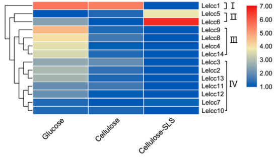 Gene expression patterns are usually closely related to their functions. The expression profiles of the laccase genes were classed into four groups (I, II, III, and IV), according to their respective similar expression patterns, as shown in Figure 4 (for detail, see Supplementary Figure S2). The relative transcription levels of Lelcc1 in CYM and CYM-C culture mediums were 48.3 and 43.9 times higher than that of the CYM-C + SLS culture medium. Compared to their expression in the other two carbon sources, the laccase genes of Group II (Lelcc5 and Lelcc6) tended to be induced by the mixed carbon source (microcrystalline cellulose plus 0.1% sodium lignosulfonate), with their relative expression levels showing a 12.4- and 101.6-fold increase, respectively. These results were consistent with the comparative secretomic data published previously [27]. The most Lelcc genes in group III (Lelcc4, Lelcc8, Lelcc9, and Lelcc14) were observed to be transcribed almost exclusively in the CYM culture medium. The remaining seven laccases were clustered into Group IV, with higher expression levels detected in CYM or CYM-C medium than in CYM-C + SLS. Moreover, the changes in the relative expression levels of the same genes in group IV were relatively small. Collectively, the expression of most Lelcc genes was significantly altered in diverse carbon sources, implying that the Lelcc genes might be involved in fungal utilization and degradation of carbon sources.