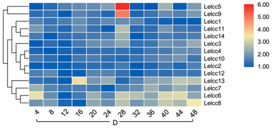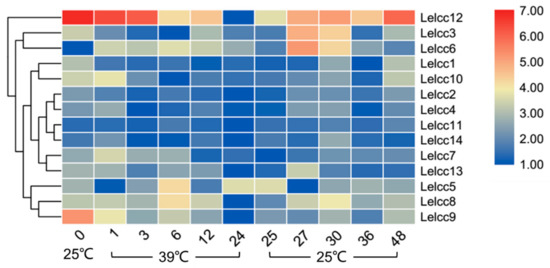 Heatmap of the expression profiles of laccase genes from L. edodes (Lelcc) under high-temperature stimulation. The heatmaps with hierarchical clustering were visualized using the software TBtools 0.665 and the values were log2-transformed with normalization. The blue and red elements indicate low and high relative expression levels, respectively.