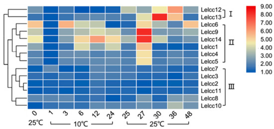 Heatmap of the expression profiles of laccase genes from L. edodes (Lelcc) under low-temperature stimulation. The heatmaps with hierarchical clustering were visualized using the software TBtools 0.665 and the values were log2-transformed with normalization. The blue and red elements indicate low and high relative expression levels, respectively.