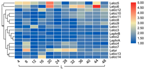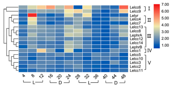 Heatmap of the expression profiles of laccase genes from L. edodes (Lelcc) in the photoperiod (24 h light/0 h dark). The heat maps with hierarchical clustering were visualized using the software TBtools 0.665 and the values were log2-transformed with normalization. The blue and red elements indicate low and high relative expression levels, respectively.