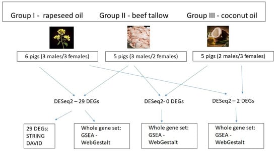In this manuscript, we describe the analysis of the effect of source of dietary fat on gene expression in adipose tissue of pigs, based on part of the data obtained in a previously described RNA sequencing experiment []. All procedures describing animal housing are described elsewhere []. In brief, crossbred fatteners were kept in individual straw-bedded pens in uniform conditions. The animals were healthy, and the most possibly uniform as regards body weight. The diets of all of the groups were isonitrogenous and isoenergetic and were formulated to cover the nutritional requirements of the pigs. The animals were divided into three dietary groups in which the diets differed among each other in terms of fodder fat: 3% rapeseed oil (group I), 3% beef tallow (group II), and 3% coconut oil (group III) (Figure 1). The ingredient composition and nutritive value of the diets, as well as the fatty acid compositions of the fat sources and feed mixtures, are presented elsewhere []. Briefly, group I feed mixture contained 80% of UFA content (44% MUFA and 36% PUFA), group II contained 67% of UFA (32% MUFA and 35% PUFA), and group III contained 45% of UFA (16% MUFA and 29% PUFA). The ratio of UFA/SFA in the used feed mixtures was: 4.7, 2.1, and 0.8 for group I, II, and III, respectively. The experimental fattening lasted from 60 to 118 kg of live weight of the animals. At the end of the experiment, all the pigs were slaughtered by stunning with high-voltage electric tongs (voltage 240–400 V), and samples of subcutaneous adipose tissue from the area between the last thoracic and the first lumbar vertebrae were collected for transcriptome analysis. All samples were stored in a freezer (−85 °C) until analysis.