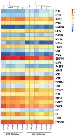The statistics of the RNA-sequencing are presented in detail elsewhere []. In brief, we obtained, on average, 15,534,039 filtered reads per sample. More than 82% of them were mapped to Sus scrofa 11.1. All gene expression data has been submitted previously to the GEO accession number (accession number: GSE101433). Using DESeq2 software, we performed comparisons of gene expression between all three dietary groups (rapeseed oil vs. beef tallow, rapeseed vs. coconut oil, beef tallow vs. coconut oil, the first group in the comparison is the reference group). We identified 29 DEGs in the rapeseed oil vs. beef tallow comparison (15 upregulated and 14 downregulated in the beef tallow group, and only two DEGs (CD209 and FAM16) in the beef tallow vs. coconut oil comparison. No differentially expressed genes were observed in the rapeseed oil vs. coconut oil comparison (Table 1, Figures S1 and S2). Accordingly, only the first comparison—rapeseed oil vs. beef tallow—created hierarchical clusters (Figure 2).